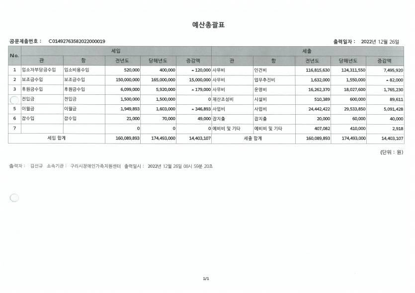 - 다음글2022년 구리시장애인가족지원센터 3차 추가경정예산 공개 22.12.05