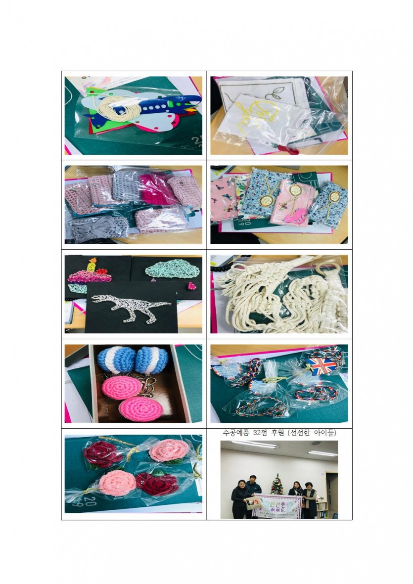 선선한 아이들에서 수공예품 32점을 후원해주셨습니다~ 페이지 정보 작성자 관리자 댓글 0건 조회 1,893회 작성일 19-12-06 00:21 목록 본문 페이스북 공유 트위터 공유 구글+ 공유 선선한 아이들에서 수공예품 32점을 후원해주셨습니다~ 이전글장애인 생활체육 프로그램(마지막회기) 19.12.17 다음글청소년 발달장애 당사자 미술활동 프로그램(9회기) 19.11.27