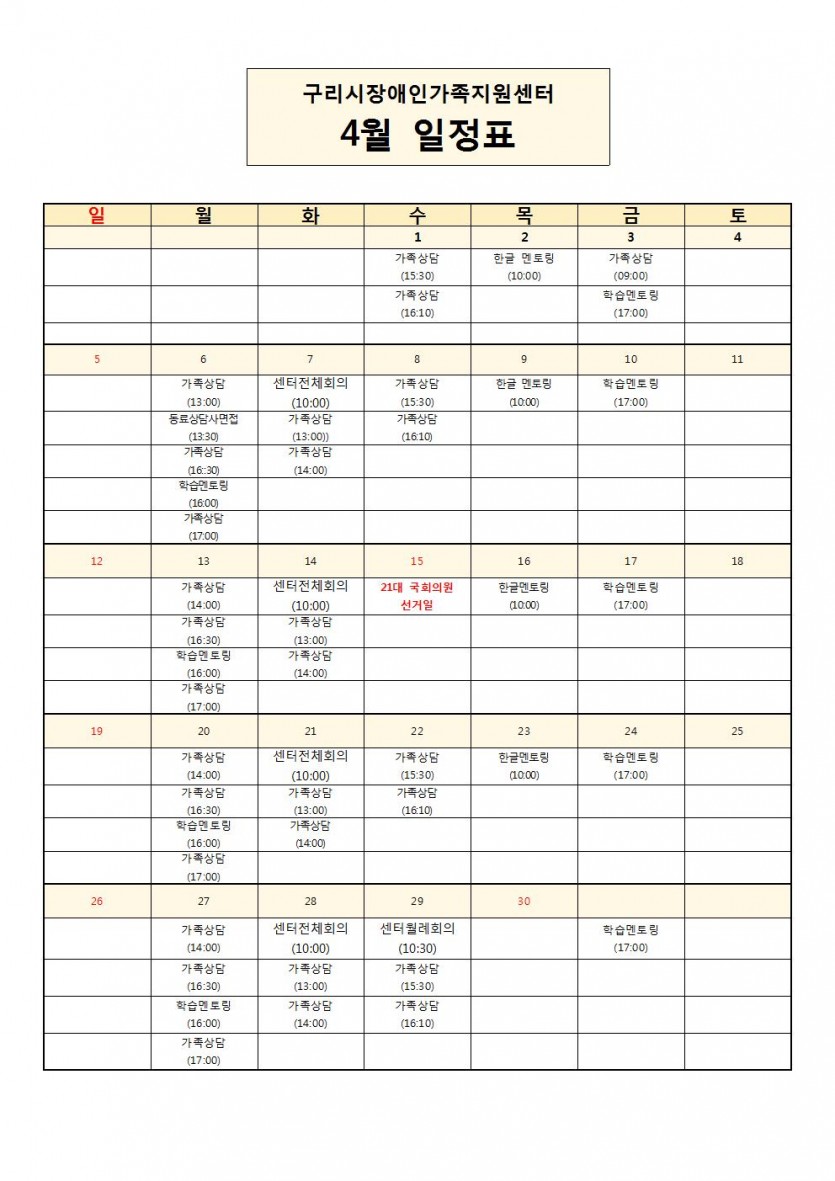 2020년 4월 구리시장애인가족지원센터 일정안내 페이지 정보 작성자 김선규 댓글 0건 조회 7,828회 작성일 20-04-03 00:18 목록 본문 페이스북 공유 트위터 공유 구글+ 공유 2020년 4월 구리시장애인가족지원센터 일정안내입니다. 이전글(긴급) 2020년 구리시장애인가족지원센터 동료상담사 채용 20.04.07 다음글(긴급)2020년 구리시장애인가족지원센터 동료상담사 채용 20.03.27 댓글 0 댓글목록 등록된 댓글이 없습니다.