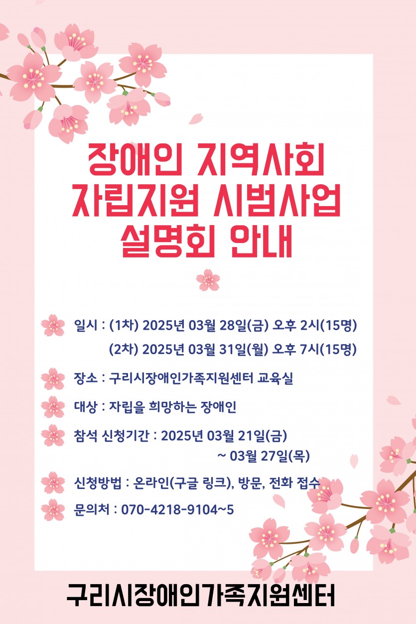장애인 지역사회 자립지원 설명회 개최 안내 페이지 정보 작성자 가족지킴이 댓글 0건 조회 1,702회 작성일 25-03-21 14:08 목록 본문 페이스북 공유 트위터 공유 구글+ 공유 2025년 장애인 지역사회 자립지원 설명회 개최 안내온라인 신청: https://forms.gle/ECUddiQPpwUdv4w69 이전글25년 4월 구리시장애인가족지원센터 일정안내 25.04.04 다음글25년 3월 구리시장애인가족지원센터 일정안내 25.03.06 댓글 0 댓글목록 등록된 댓글이 없습니다.