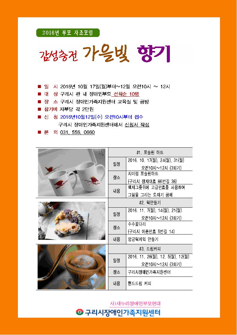 2016년 부모 자조모임 감성충전 가을빛 향기 (사진 첨부) 페이지 정보 작성자 김용기 댓글 0건 조회 7,853회 작성일 16-10-11 00:18 목록 본문 페이스북 공유 트위터 공유 구글+ 공유 이전글발달장애인 자립생활준비 체험홈 프로그램 모집안내 16.12.09 다음글발달장애부모 힐링 백일장 어머니, 나르샤 공고 16.09.28 댓글 0 댓글목록 등록된 댓글이 없습니다.