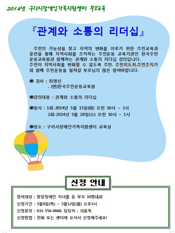 부모교육 <관계와 소통의 리더십> 페이지 정보 작성자 이윤옥 댓글 0건 조회 7,003회 작성일 14-05-09 00:18 목록 본문 페이스북 공유 트위터 공유 구글+ 공유 이전글부모교육 <사회적기업과 협동조합의 이해> 14.05.13 다음글<뮤지컬 체험,교육 프로젝트> 14.04.30 댓글 0 댓글목록 등록된 댓글이 없습니다.