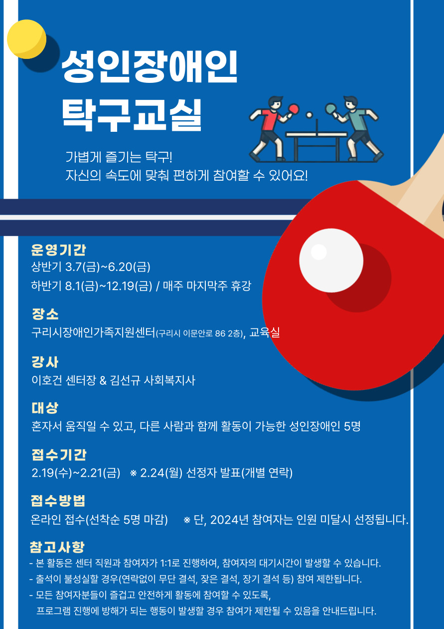 2025년 성인장애인 "탁구교실" 추가(1명), 예비 참여자 모집