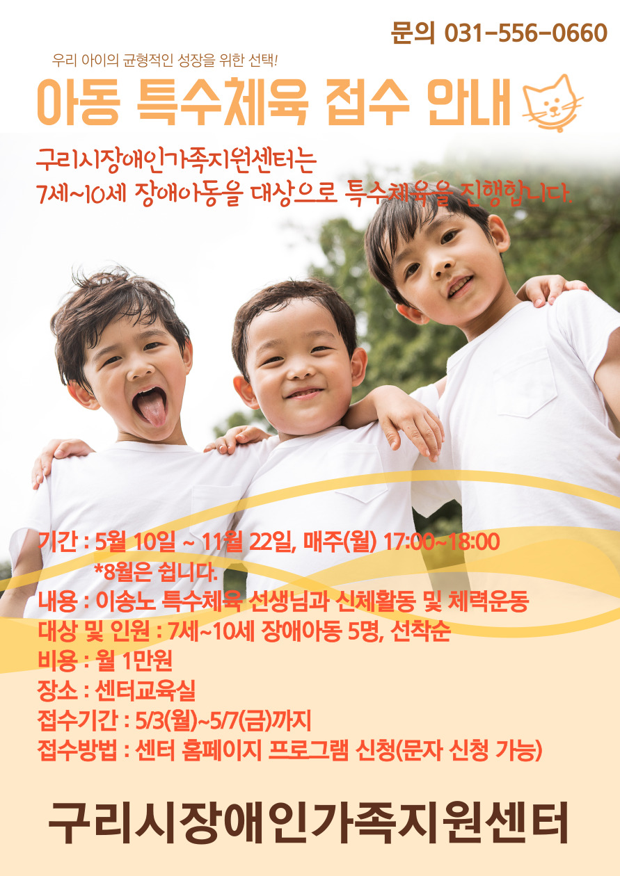 장애아동 7세~10세 특수체육 프로그램 신청 안내(1일 연장, 5/7일까지)